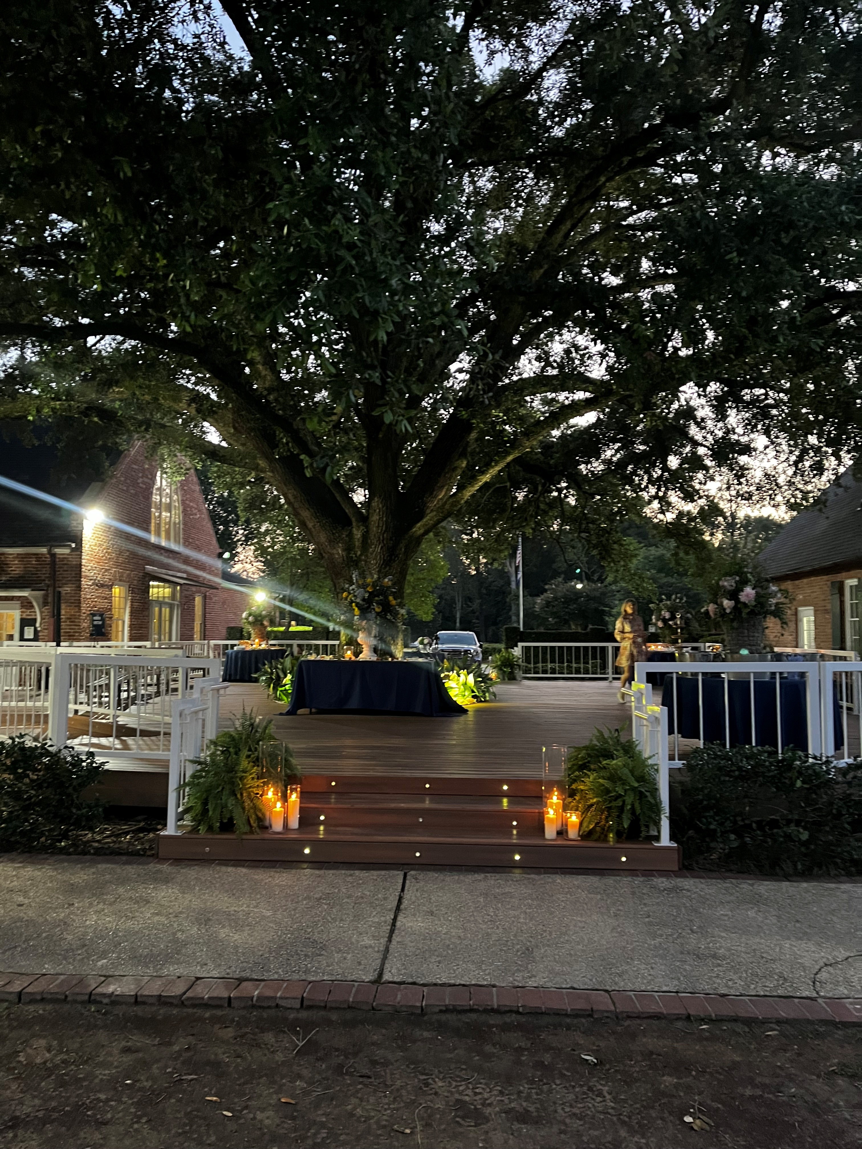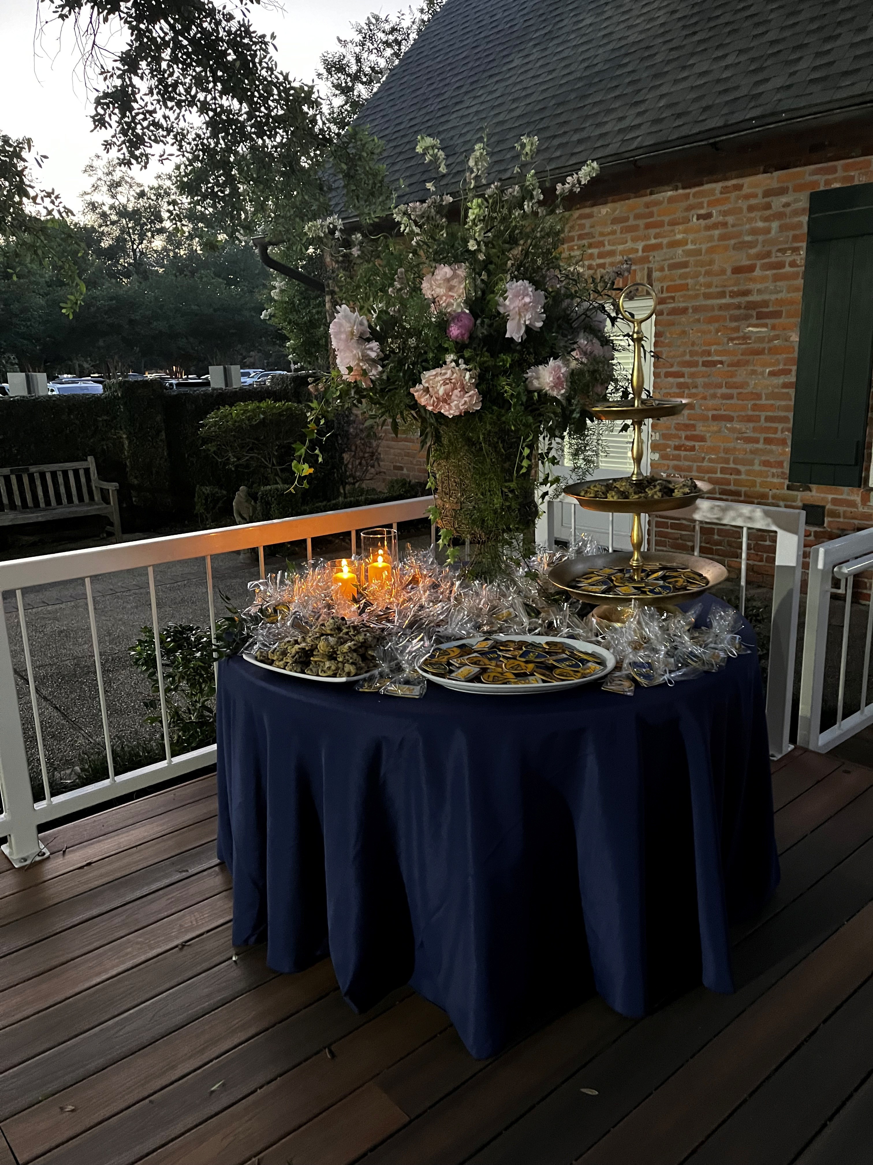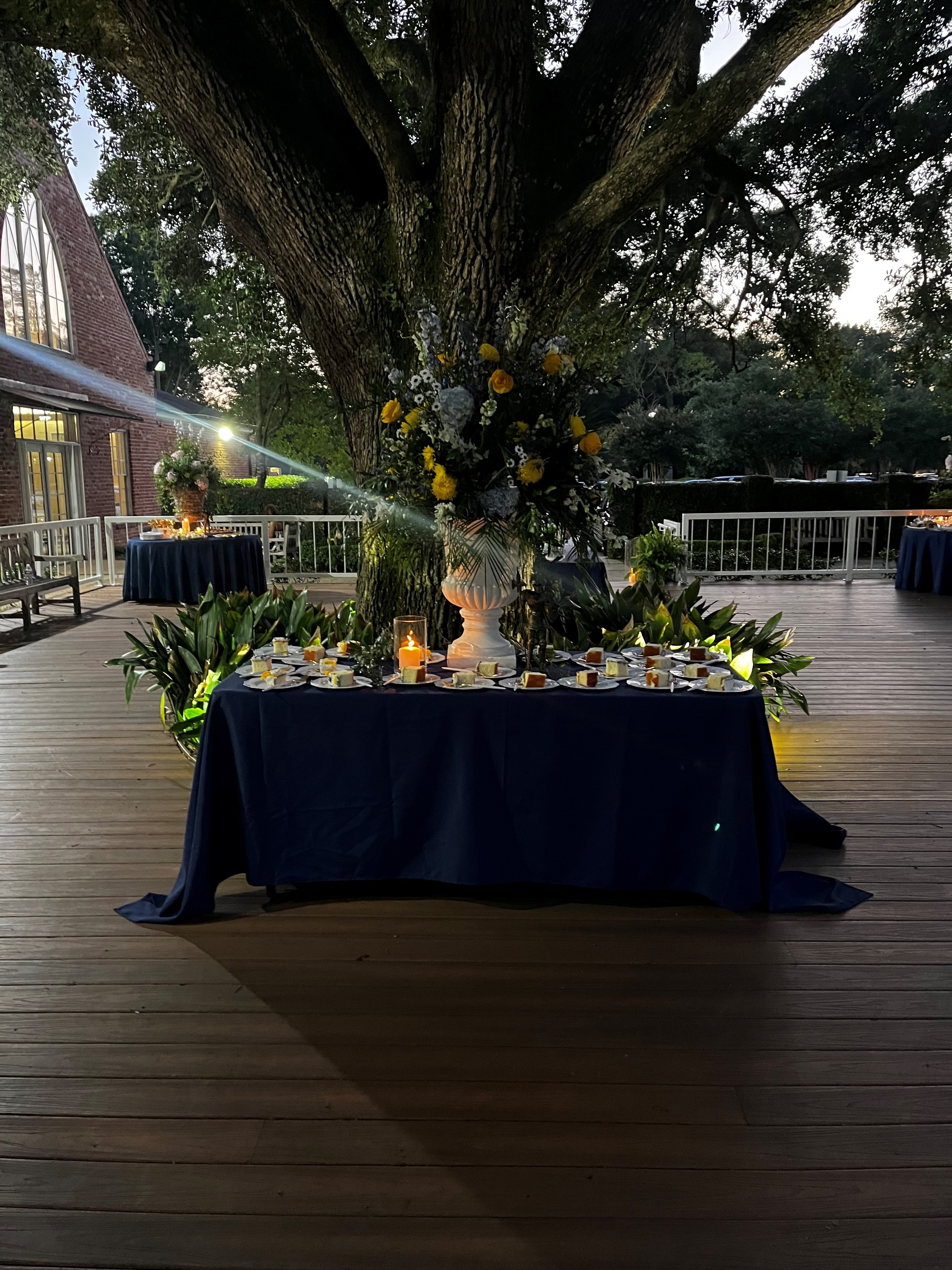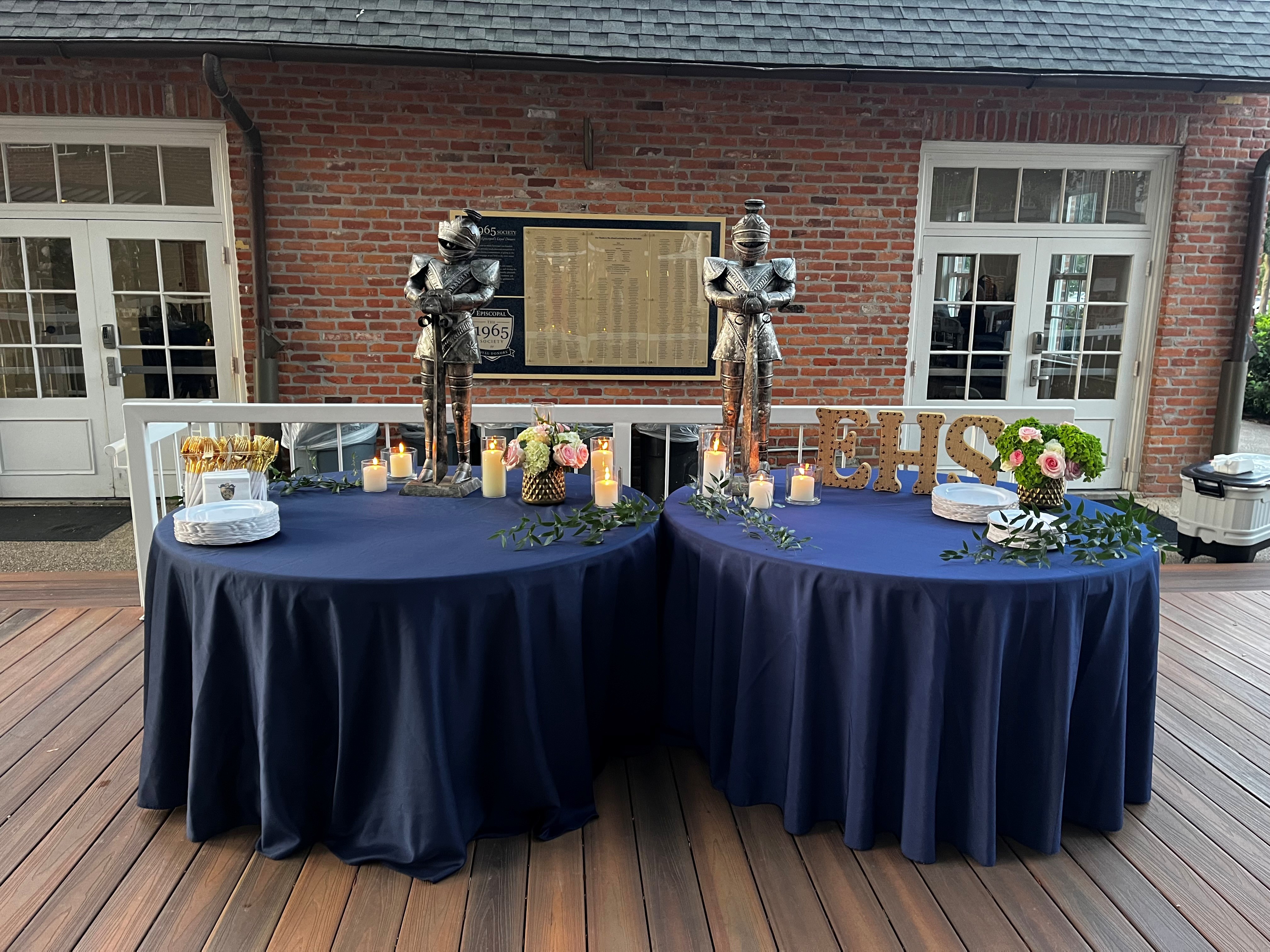 Round tables on deck with navy tablecloths